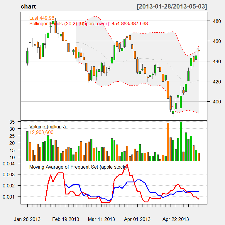To plot time dynamics of frequent sets of keywords, you need to specify a frequent set in the lower case, e.g. "apple", "apple aapl", "apple iphone", etc.; then choose a Stock symbol for comparing time series and choose the time windows for two moving averages, then click on the button "Plot Dynamics of Frequent Sets". The time dynamics of frequent sets of keywords includs two moving averages which can be used for trading strategy with the intersection of two moving averages.
